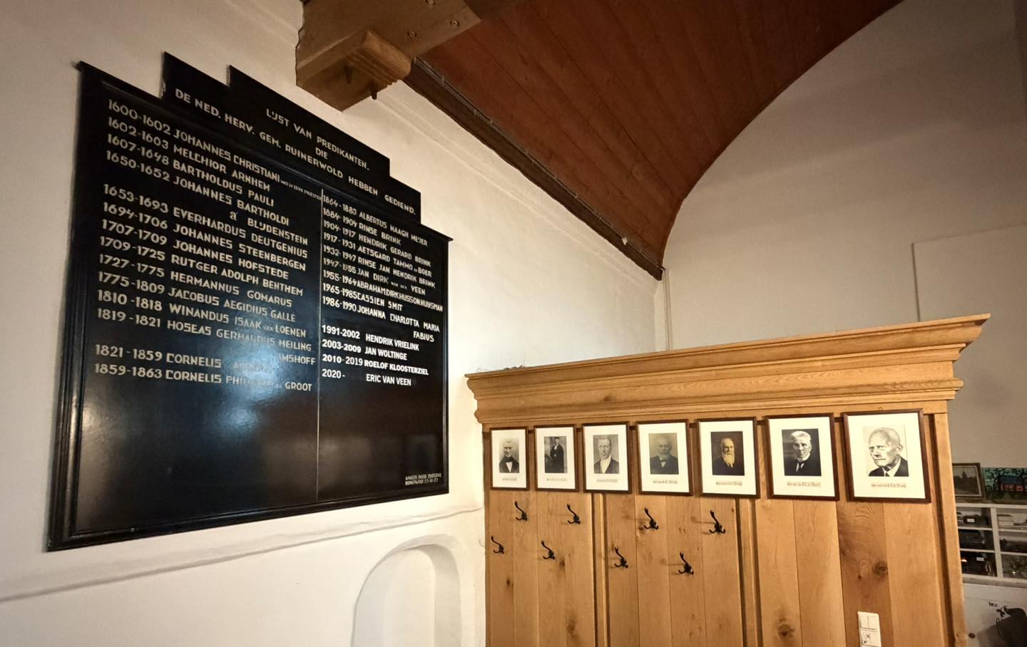 De foto’s van de dominees vanaf 1821, hangen weer in de kerk na een grondige restauratie in Hoogeveen.