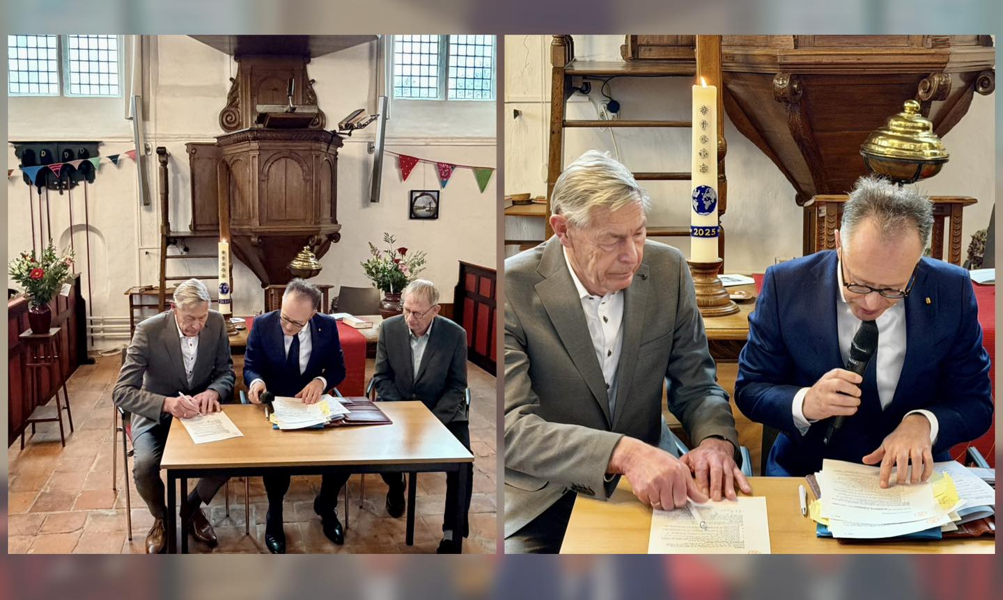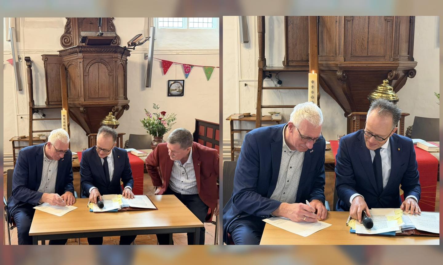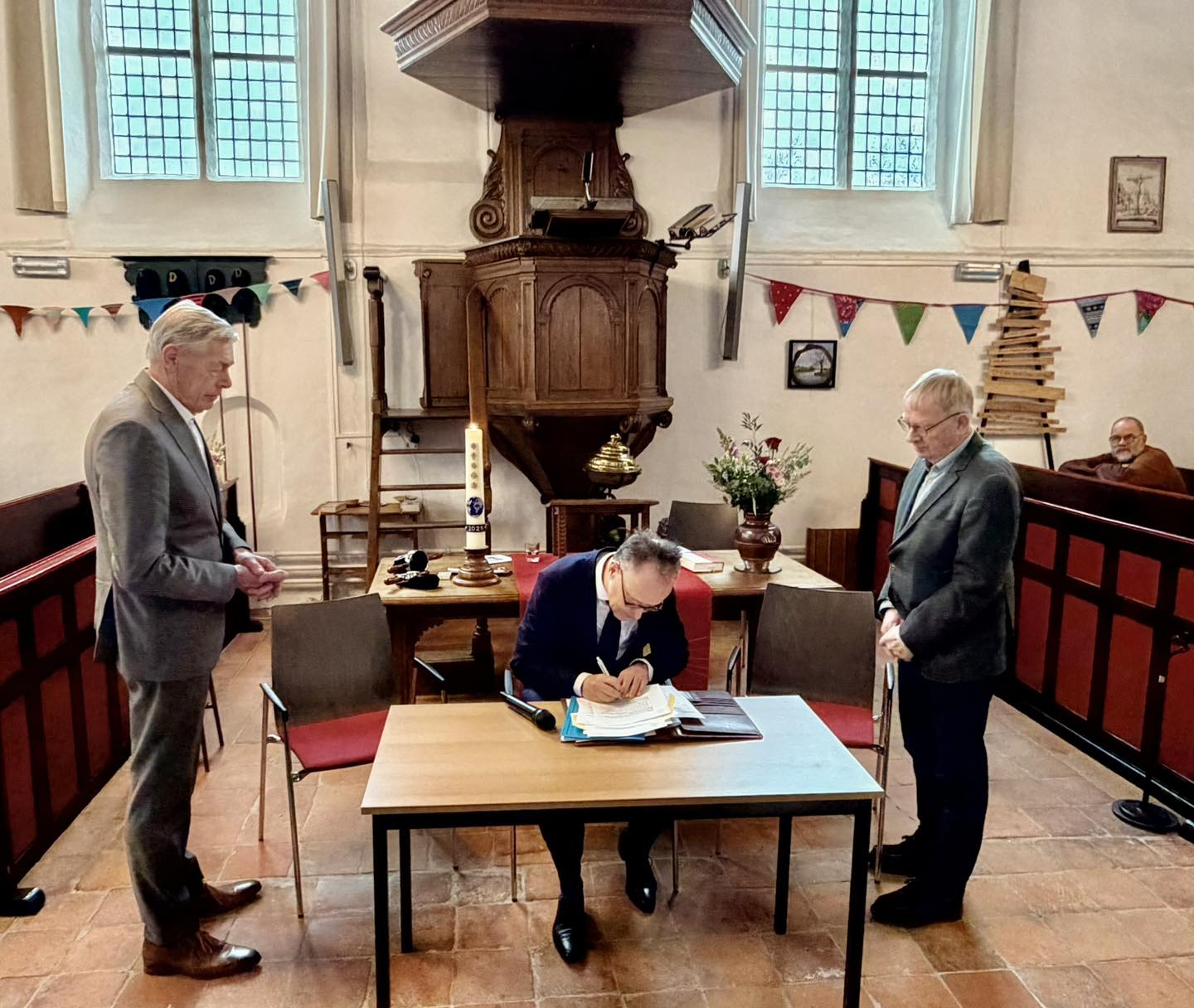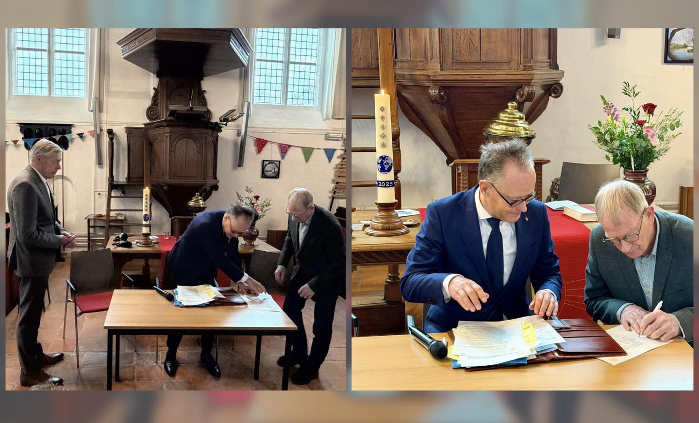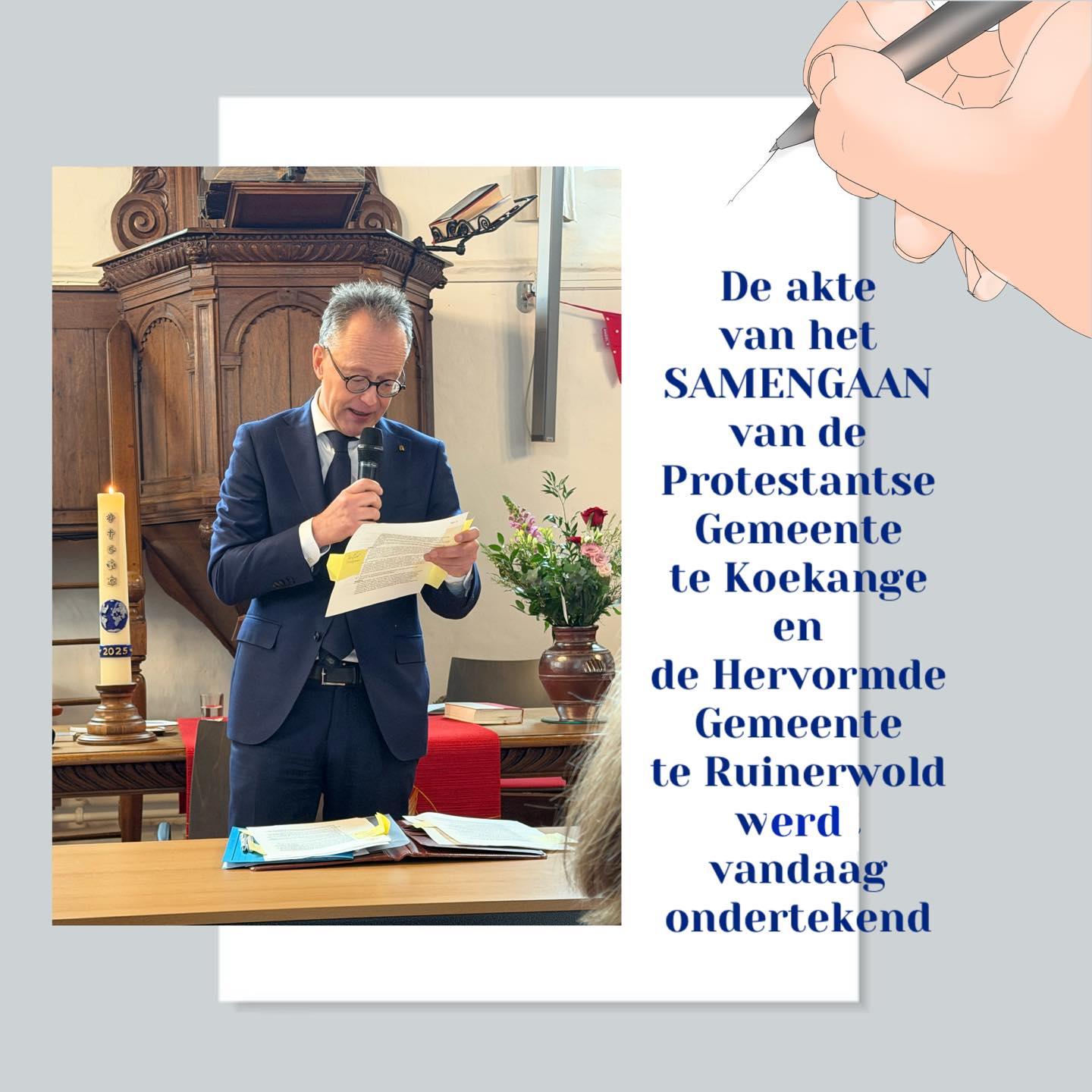 Na de dienst wordt gevraagd te gaan zitten en zal het formele fusiemoment plaatsvinden met het tekenen van de akten.