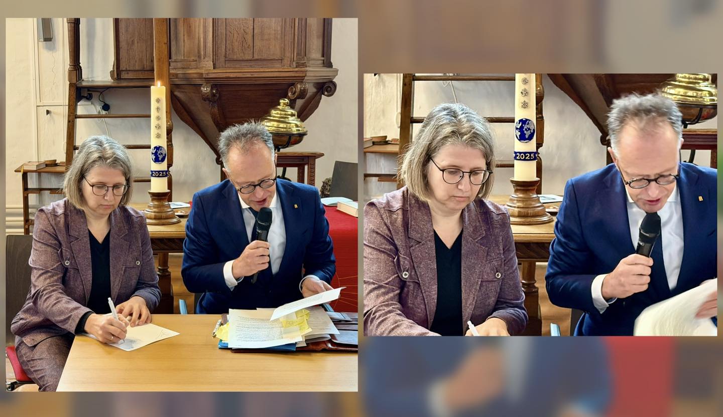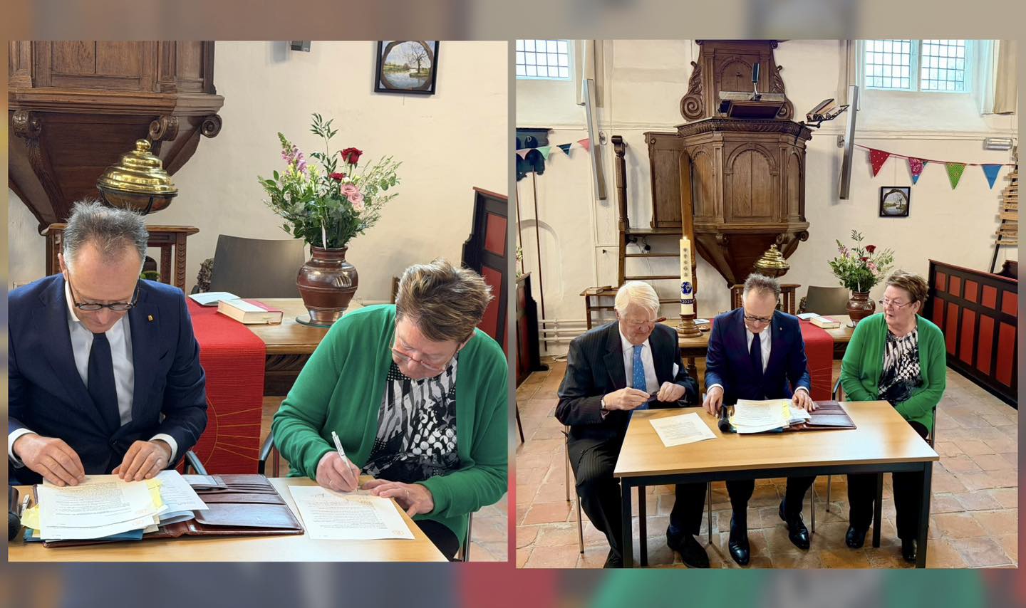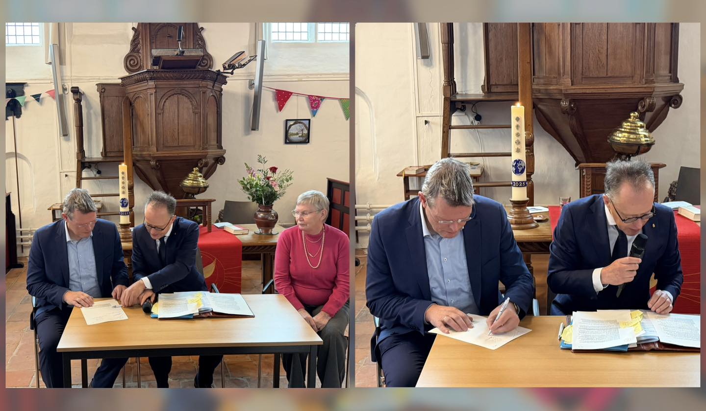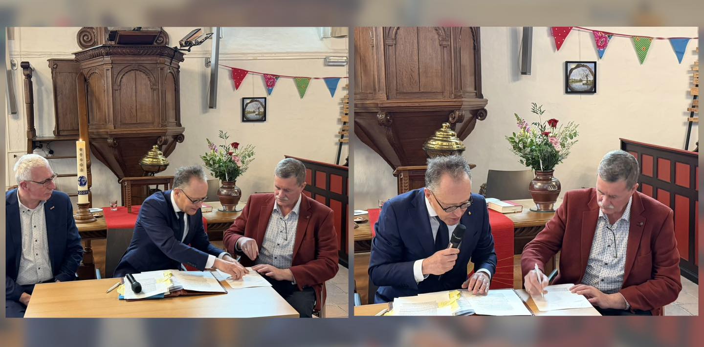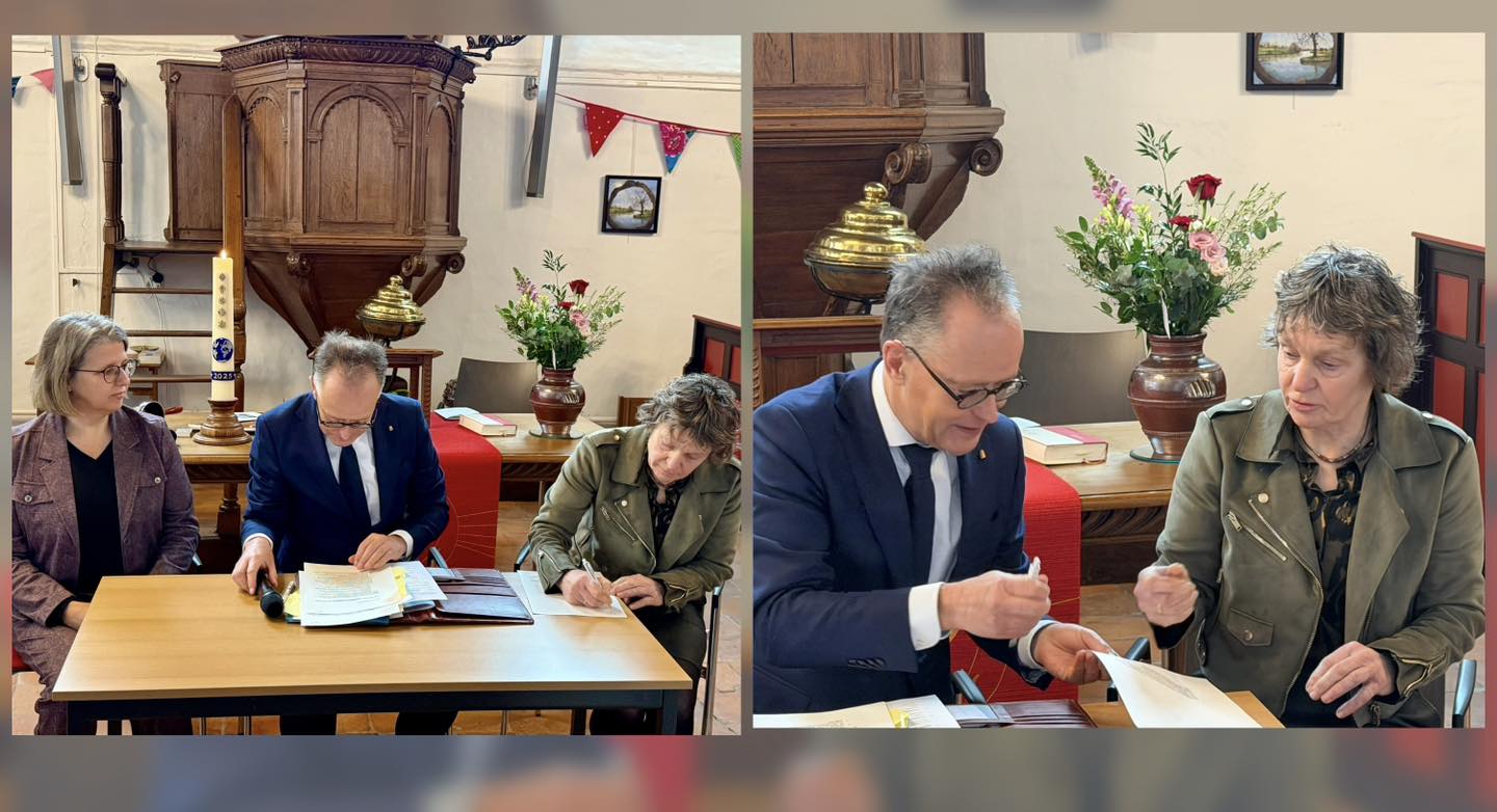 Na de dienst wordt gevraagd te gaan zitten en zal het formele fusiemoment plaatsvinden met het tekenen van de akten.