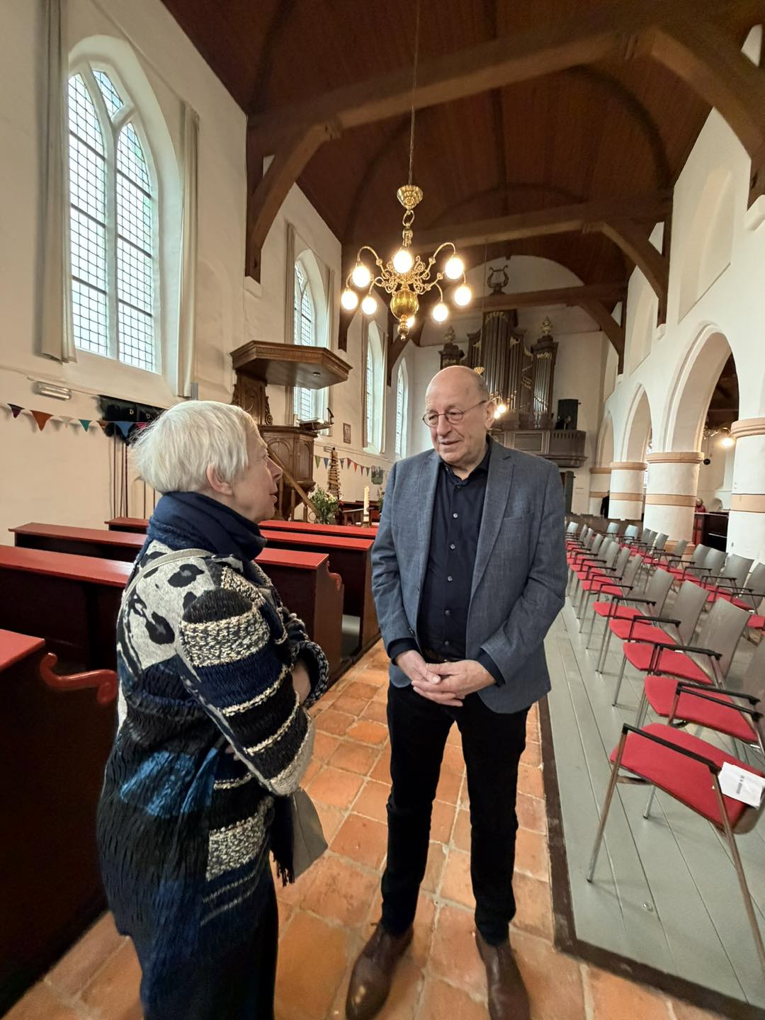 Albert Haar, de wethouder van de gemeente De Wolden, hier in gesprek met Mieneke Bout.